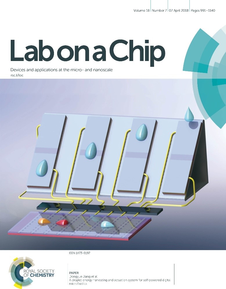 近日,我室陈贵军和姜东岳副教授课题组的研究成果《A droplet energy harvesting and actuation system for self-powered digital microfluidics》被国际一流SCI一区刊物《Lab on a chip》收录,并被评选为2018年第7期封面。