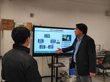 首先,宋永臣教授为严晋躍教授就近几年课题组在天然气水合物开采及二氧化碳减排两个方向所取得的重要进展做了简要阐述。随后,严教授又一一参观了各实验室,对实验室目前的研究工作及进展做了详细了解,在肯定的同时也提出了不少自己的意见,鼓励同学们继续积极探索,为能源事业做出贡献。