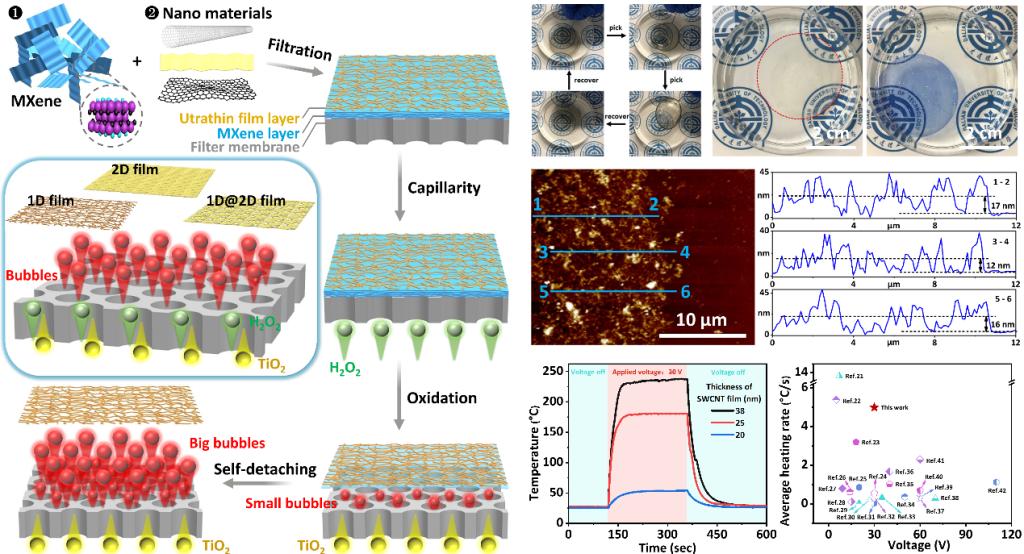 MXene作为一类热门的二维过渡金属碳化物/氮化物,近年来吸引了极大的关注,然而其易氧化的特点是该材料一个致命的弱点。本研究利用其易氧化反应的不足作为可控界面反应与相分离的关键。通过溶解逐层过滤的MXene/LDM双面薄膜中的MXene层,原位产生气泡层形成稳定浮升作用,快速无损的剥离沉积的LDM层,获得厚度低至 15-60 nm的超薄、透明、自支撑薄膜。利用优化的界面产泡反应,完整剥离一片直径40 mm、厚度20 nm、 透光度在90%以上的膜仅需80 s,且制备过程易放大,获得的自支撑膜能够轻松的转移至任意基底上。通过这种方法制备的超薄、透明碳管膜被加工成为透明加热电极,表现出了优异的柔韧性、透光性和快速升温及恒温性能,有望在飞机、汽车视窗除冰、防冰领域发挥重要的作用。
